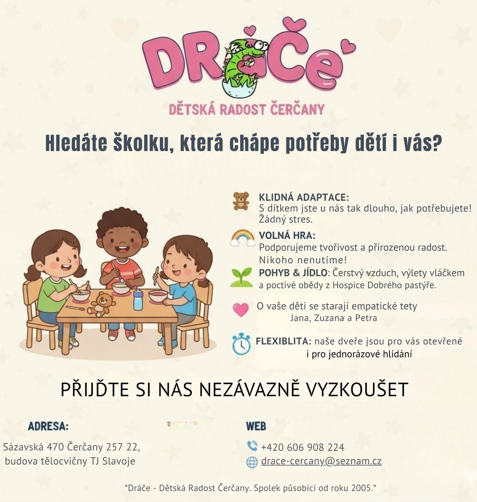 Přijďte za námi do školy, školky nebo na některou z naších akcí. Spolek DRáČe již několik let nabízí obyvatelům Čerčan a okolí akce pro děti i dospělé, které přispívají k jejich vzdělávání a rozvoji.